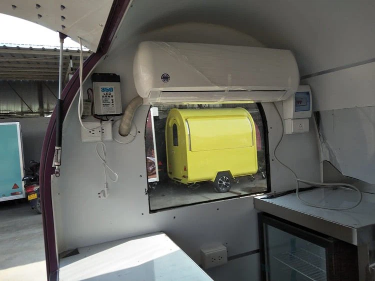 El remolque de concesión de helados de servicio suave tiene una unidad de aire acondicionado montada en la pared que ocupa un área de basura en este pequeño remolque. La unidad se instala sobre la ventana lateral para que el aire frío pueda refrescar el remolque de comida y a su personal de manera eficiente. Cerca de la ventana, hay un enchufe eléctrico para el aire acondicionado. No se preocupe por el generador sobrecargado. Nuestro ingeniero calculará primero los vatios de todas las máquinas eléctricas en su remolque antes de recomendarle un generador ideal para usted. ¡Con todo lo que se cuenta, el generador puede producir suficiente energía para mantener el equipo en funcionamiento!
